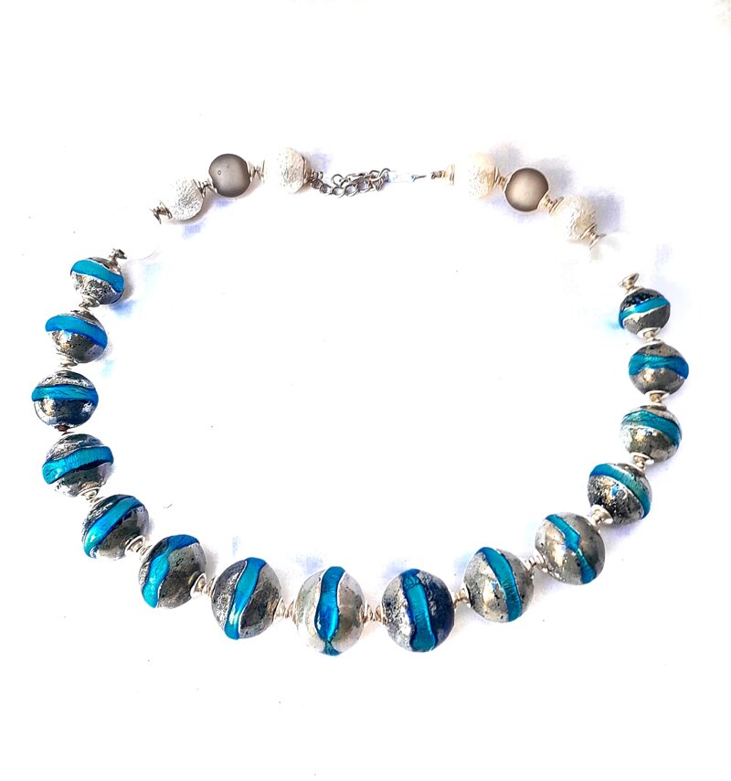 Collana in Vetro di Murano dall' Artista Marta Rossetto secondo la tecnica della lavorazione a Lume con l'aggiunta di foglie d'argento 925 kt inglobate in ogni singola perla